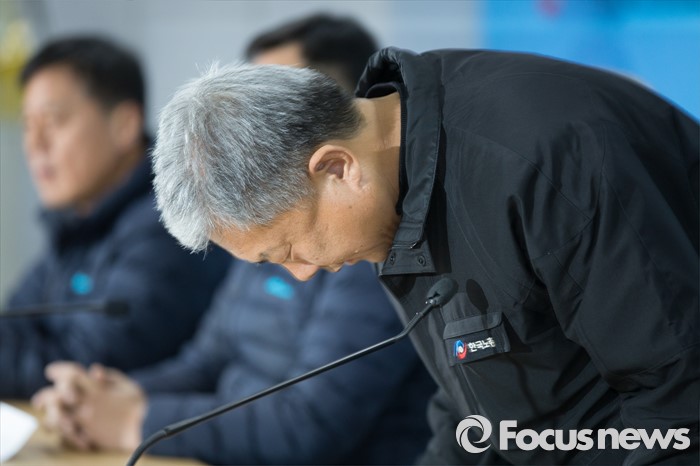 (서울=포커스뉴스) 김동만 한국노총 위원장이 19일 오후 서울 영등포구 한국노동조합총연맹에서 열린 노사정합의 파기 선언 한국노총 기자회견 시작 전 인사를 하고 있다.