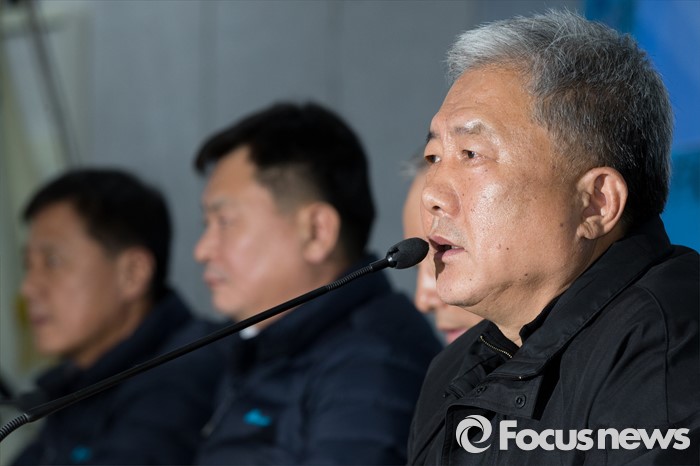 (서울=포커스뉴스) 김동만 한국노총 위원장이 19일 오후 서울 영등포구 한국노동조합총연맹에서 열린 노사정합의 파기 선언 한국노총 기자회견에 선언을 하고 있다.