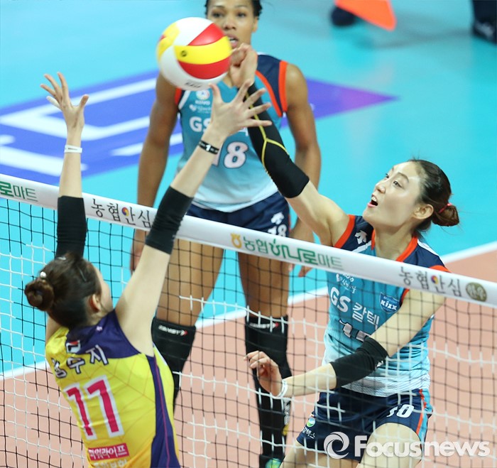 (서울=포커스뉴스) 19일 장충체육관에서 열린 '2015-2016NH농협 V-리그' 여자부 GS칼텍스-흥국생명 경기에서 GS칼텍스 배유나의 공격을 흥국생명 김수지가 블로킹으로 막고 있다.