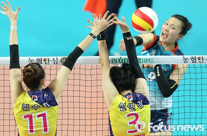 (서울=포커스뉴스) 19일 장충체육관에서 열린 '2015-2016NH농협 V-리그' 여자부 GS칼텍스-흥국생명 경기에서 GS칼텍스 표승주가 흥국생명 김수지, 신연경의 블로킹을 피해 빈 공간으로 공격하고 있다.