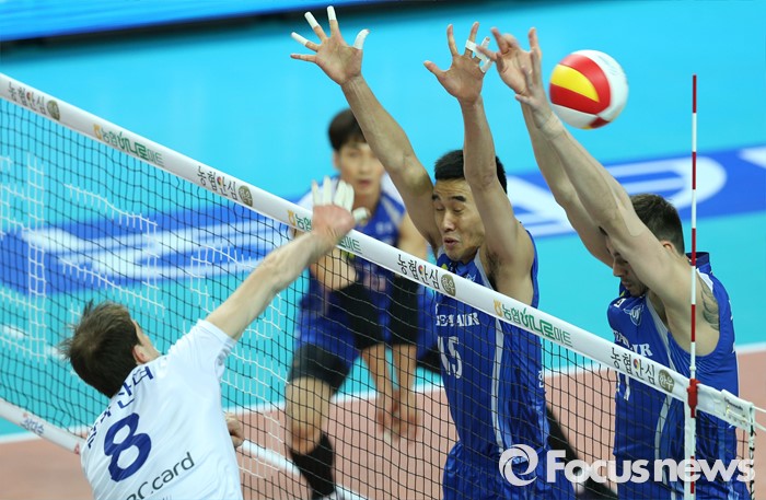(서울=포커스뉴스) 19일 장충체육관에서 열린 '2015-2016NH농협 V-리그' 남자부 우리카드-대한항공 경기에서 우리카드 알렉산더가 대한항공 김형우, 모로즈의 블로킹 위로 스파이크하고 있다.