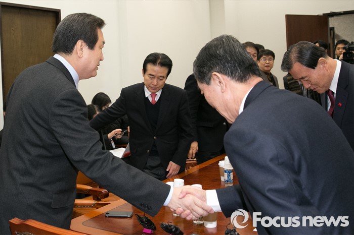 (서울=포커스뉴스) 김무성(왼쪽) 새누리당 대표가 20일 오전 서울 여의도 국회에서 열린 새누리당 제1차 총선기획단 회의에 참석해 단장인 황진하(오른쪽) 사무총장과 악수하고 있다.