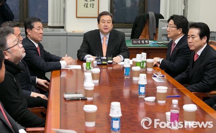 (서울=포커스뉴스) 김무성(오른쪽 세번째) 새누리당 대표가 20일 오전 서울 여의도 국회에서 열린 새누리당 제1차 총선기획단 회의에 참석해 모두발언하고 있다.