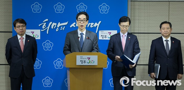 (세종=포커스뉴스) 이준식 사회부총리 겸 교육부장관이 19일 오전 세종시 정부세종청사 교육부 공용브리핑룸에서 국민행복분야 정부합동 업무보고 사전브리핑을 하고 있다. 왼쪽부터 고영선 고용노동부 차관, 이 부총리, 방문규 보건복지부 차관, 권용현 여성가족부 차관.