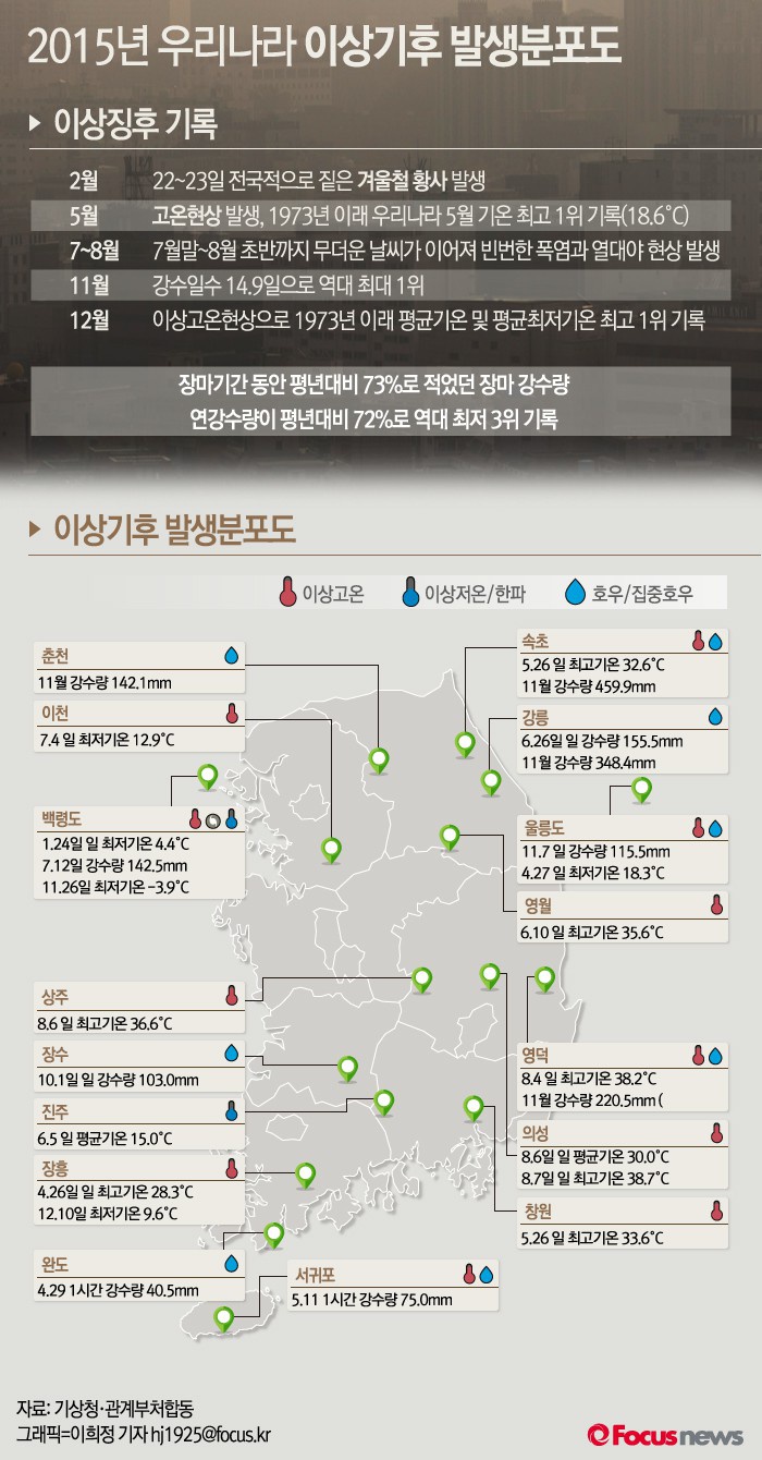 (서울=포커스뉴스) 기상청과 관계부처 합동으로 발간된 2015년 이상기후 보고서에 따르면 2015년 한 해 동안 이상고온, 폭설, 집중호우, 가뭄, 한파 등 다양한 이상기후가 발생했다.