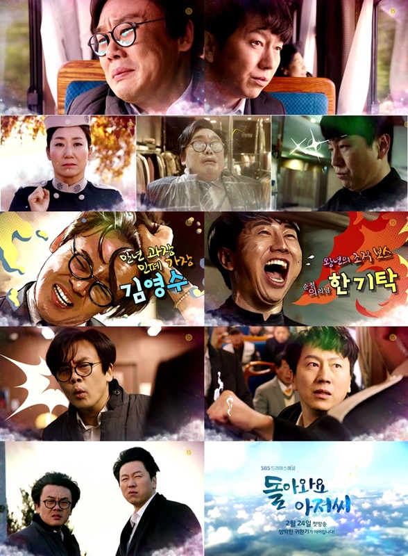 SBS 새 수목드라마 '돌아와요 아저씨'는 죽음 이후 180도 다른 인물로 변해 현세로 돌아온 두 저승 동창생들이 다시 한 번 세상을 살아가는 내용을 그린 휴먼 판타지 코믹 드라마. '미녀는 괴로워'를 집필한 노혜영 작가의 첫 드라마 데뷔작이다. 드라마 '옥탑방 왕세자' 연출을 맡은 신윤섭 PD가 합세했다. 오는 2월 24일 오후 10시에 첫 방송된다.SBS 새 수목드라마 '돌아와요 아저씨'의 1차 티저 영상이 공개됐다. 사진은 티저 영상 장면 모음.<사진출처=SBS>
