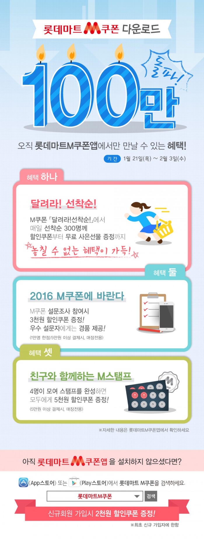M쿠폰 앱 이용 시 경험했던 혜택과 사용 후기에 대한 설문 조사도 한다. 참여자에 한해 금액 할인 쿠폰을 제공하며, 우수 참여자로 선정된 소비자에게는 1년간 100만원 상당의 할인 쿠폰을 전달할 계획이다.
