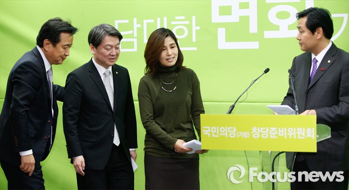 (서울=포커스뉴스) 국민의당 (가칭) 안철수 인재영입위원장과 '아이들미래위원회' 대표에 임명된 천근아 연세대 교수가 20일 오전 서울 마포구 당사 영입 발표 회견장을 들어서고 있다.