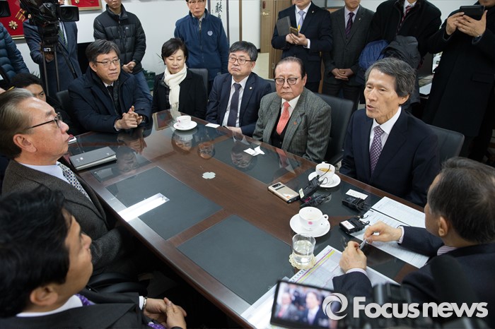 (서울=포커스뉴스) 한상진 국민의당 창당준비위원장이 20일 오전 서울 여의도 광복회를 방문해 박유철 광복회장과 관계자들과 함께 대화하고 있다.