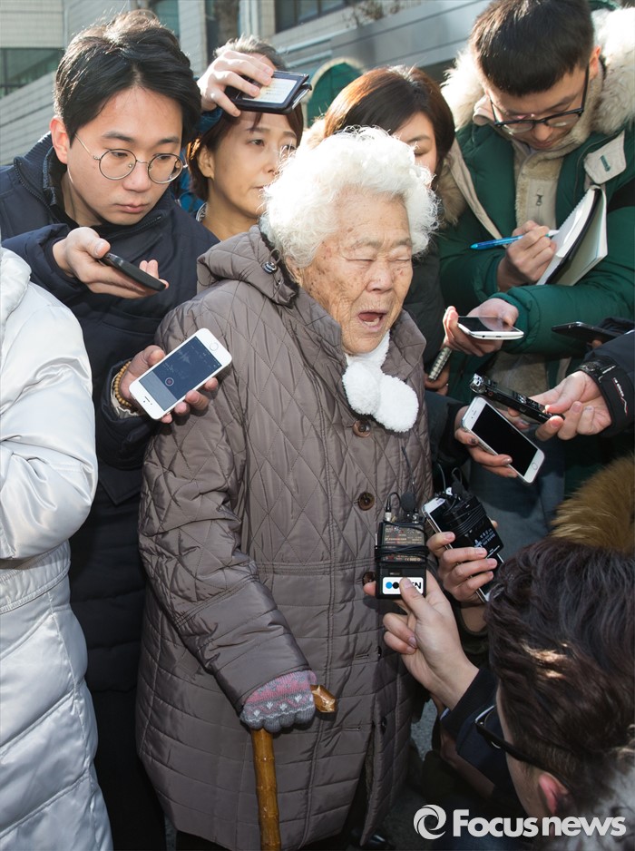 (서울=포커스뉴스) 책 '제국의 위안부'를 써 일본군 위안부 피해자들의 명예를 훼손했다는 혐의로 재판을 받게 된 박유하 세종대 국제학부 교수에 대한 공판이 열린 20일 오전 서울 광진구 동부지방법원에서 공판이 끝난 뒤 위안부 피해자 이옥선 할머니가 취재진의 질문에 답변하고 있다.