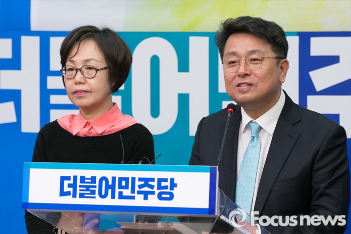 (서울=포커스뉴스) 이철희(오른쪽) 두문정치연구소 소장과 권미혁 한국연성단체연합 전 대표가 20일 오전 서울 여의도 국회 더불어민주당 대표실에서 열린 입당 기자회견에 참석해, 기자 질문에 답변하고 있다.
