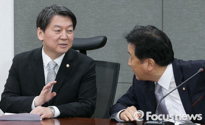 (서울=포커스뉴스) 20일 오전 서울 여의도 국회 의원회관에서 열린 국민의당 소속 의원단 회의에 안철수(왼쪽), 김영환 의원이 대화하고 있다.