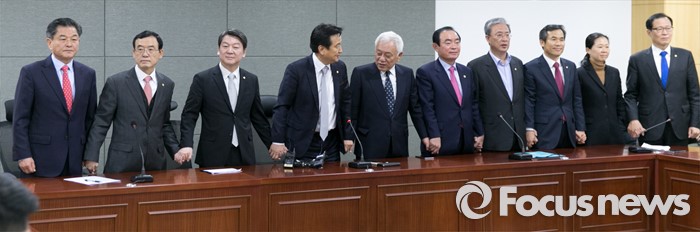 (서울=포커스뉴스) 20일 오전 서울 여의도 국회 의원회관에서 열린 국민의당 소속 의원단 회의에 참석한 의원들이 손을 잡고 취재진을 향해 포즈를 취하고 있다. 왼쪽부터 신학용, 임내현, 안철수, 김영환, 김한길, 장병완, 유성엽, 김승남, 권은희, 문병호 의원.