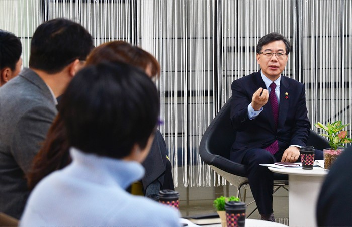 (서울=포커스뉴스) 송언석 기획재정부 차관이 20일 서울 중구 다동 문화창조벤처단지를 현장 방문해 관계자들과 간담회를 갖고 있다. <사진제공=기획재정부>