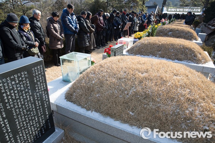 (남양주=포커스뉴스) 20일 오후 경기도 남양주시 모란공원묘지에서 용산참사7주기 추모위원회를 비롯한 유족들이 '용산참사 7주기 철거민 민중열사 추모제'를 하고 있다.