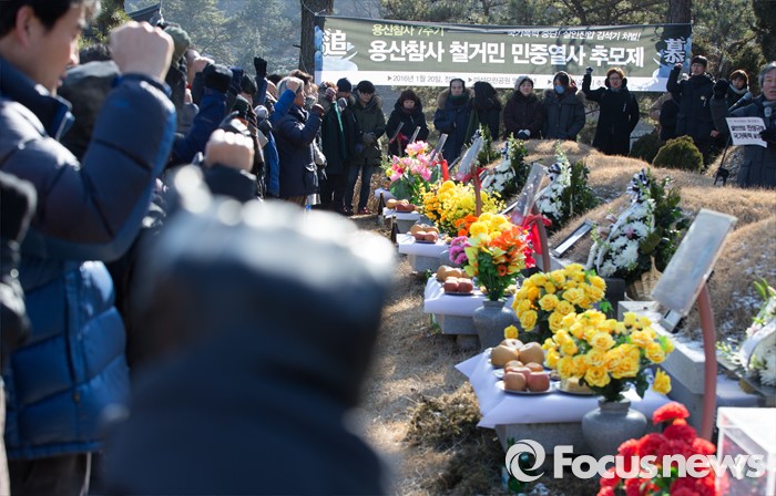 (남양주=포커스뉴스) 20일 오후 경기도 남양주시 모란공원묘지에서 용산참사7주기 추모위원회를 비롯한 유족들이 '용산참사 7주기 철거민 민중열사 추모제'를 하고 있다.