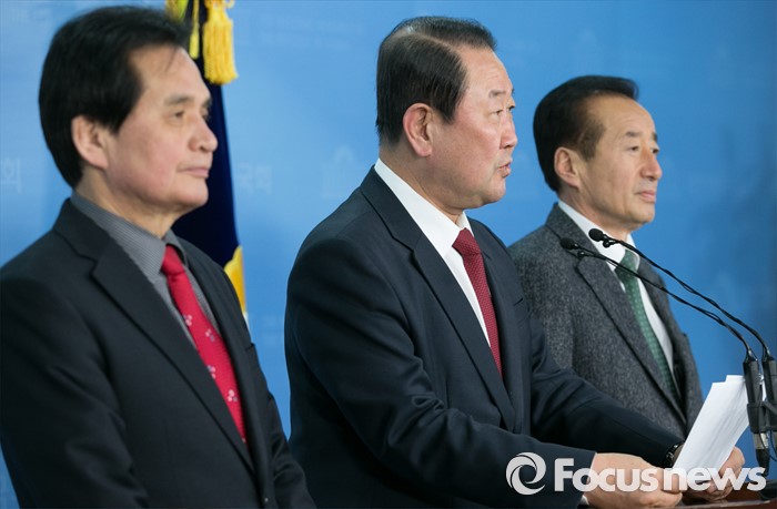 (서울=포커스뉴스) 박주선(가운데) 통합신당 창당준비위원장이 20일 오후 서울 여의도 국회 정론관에서 유선호(오른쪽), 장세환 전 의원 영입 기자회견을 하고 있다.