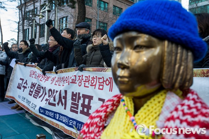 (서울=포커스뉴스) 20일 오전 서울 종로구 일본대사관 인근에서 민주사회를 위한 변호사모임 관계자들이 일본군 위안부 문제 관련 한일외교장관회담에 대한 교수, 법률가 의견서 발표 기자회견을 하고 있다.
