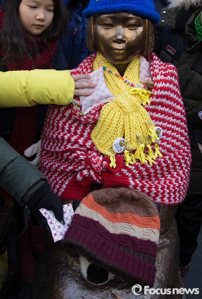 (서울=포커스뉴스) 20일 오후 서울 종로구 옛 일본대사관 앞에서 열린 제1214차 일본군 위안부 문제 해결 위한 정기수요시위에 참가한 어린이들이 소녀상에 보온용품을 올려 놓고 있다. 이날 일본군 위안부 피해자 할머니들은 연이은 혹한으로 시위에 자리하지 못했다.