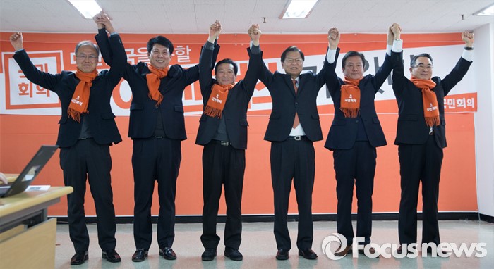 (서울=포커스뉴스) 국민회의 천정배 창당준비위원장이 20일 오후 서울 여의도국민회의 당사에서 열린 인재 입당식에서 통일/노동 분야 5명의 인사들과 함께 손을 잡고 포즈를 취하고 있다. 왼쪽부터 노동 분야 정광호 당원(전 한국노총 사무청장), 지재식 당원(전 IT연맹 위원장), 김명원 월드에너지 상무이사, 천정배 위원장, 통일 분야 도천수 당원(희망시민연대 공동대표), 전현준 당원(동북아평화협력연구원장)