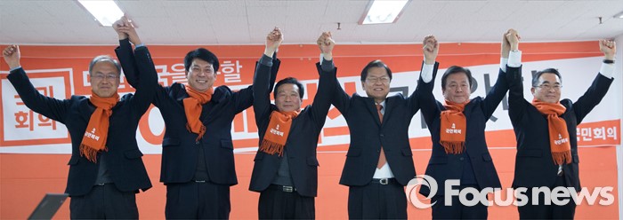 (서울=포커스뉴스) 국민회의 천정배 창당준비위원장이 20일 오후 서울 여의도 국민회의 당사에서 열린 인재 입당식에서 통일/노동 분야 5명의 인사들과 함께 손을 잡고 포즈를 취하고 있다. 왼쪽부터 노동 분야 정광호 당원(전 한국노총 사무청장), 지재식 당원(전 IT연맹 위원장), 김명원 월드에너지 상무이사, 천정배 위원장, 통일 분야 도천수 당원(희망시민연대 공동대표), 전현준 당원(동북아평화협력연구원장)