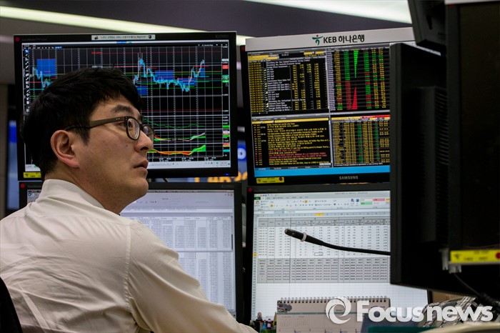 (서울=포커스뉴스) 코스피 지수가 외국인과 기관의 매도 공세에 전 거래일보다 44.19포인트(2.34%) 하락한 1,845.45에 거래를 마친 20일 오후 서울 중구 KEB하나은행 딜링룸에서 한 딜러가 업무를 보고 있다. 이날 원달러 환율은 전 거래일보다 8.1원 오른 1214원에 거래를 마감했다.