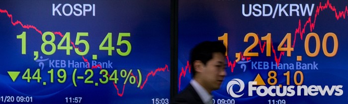 (서울=포커스뉴스) 코스피 지수가 외국인과 기관의 매도 공세에 전 거래일보다 44.19포인트(2.34%) 하락한 1,845.45에 거래를 마친 20일 오후 서울 중구 KEB하나은행 딜링룸에서 한 딜러가 업무를 보고 있다. 이날 원달러 환율은 전 거래일보다 8.1원 오른 1214원에 거래를 마감했다.