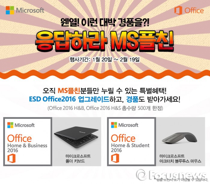 이 행사는 자사 전자 소프트웨어 다운로드(ESD) 상품인 '오피스 2016 홈&비즈니스', '오피스 2016 홈&스튜던트'를 구매하는 고객 선착순 500명에게 각각 접이식 폴더 키보드와 아크 터치 블루투스 마우스를 경품으로 제공한다.