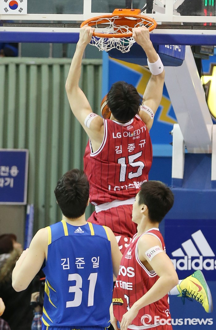 (서울=포커스뉴스) 20일 서울 잠실실내체육관에서 열린 2015-2016 프로농구 삼성-LG 경기에서 LG 김종규가 덩크슛을 성공시키고 있다.