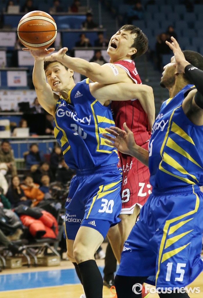(서울=포커스뉴스) 20일 서울 잠실실내체육관에서 열린 2015-2016 프로농구 삼성-LG 경기에서 LG 김영환과 삼성 장민국이 튄공을 잡으려 다투고 있다.