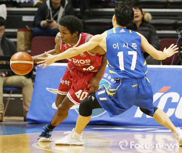 (서울=포커스뉴스) 20일 서울 잠실실내체육관에서 열린 2015-2016 프로농구 삼성-LG 경기에서 LG 샤크의 드리블을 삼성 이시준이 진로방해하며 파울하고 있다.