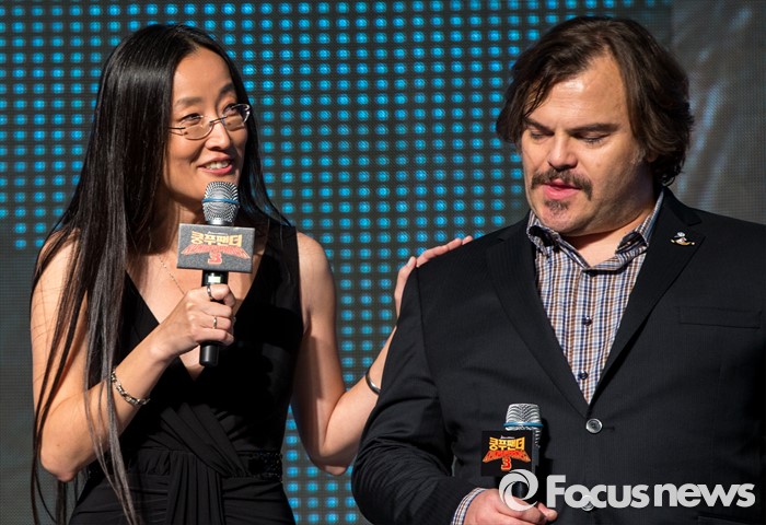 (서울=포커스뉴스) 할리우드 애니메이션 '쿵푸팬더 3' 홍보차 내한한 여인영 감독과 배우 잭 블랙이 20일 오후 서울 영등포구 타임스퀘어에서 열린 레드카펫 행사에 참석해 러블리즈와 포옹하고 있다.