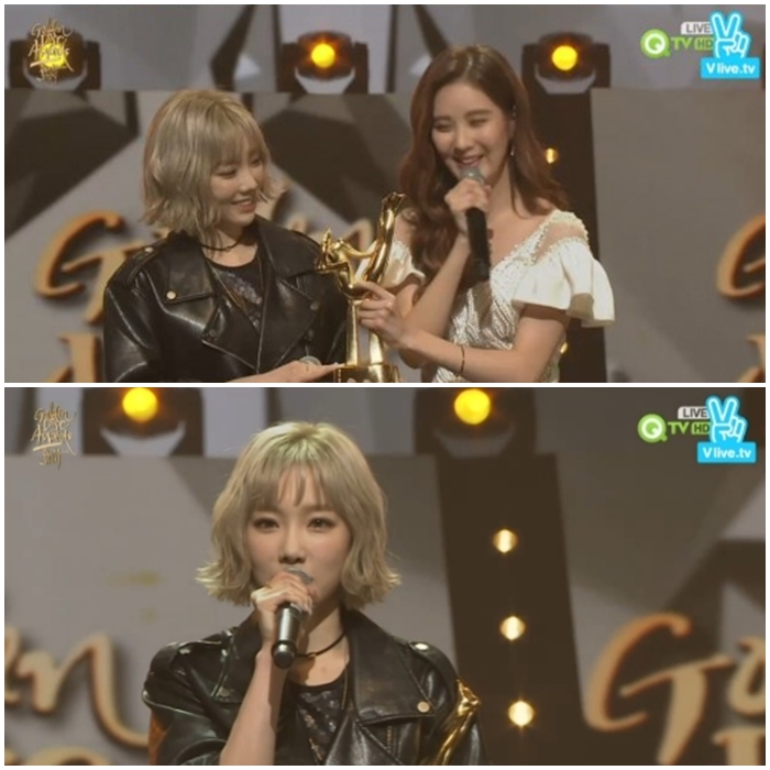 20일 오후 서울 회기동 경희대학교 평화의전당에서 열린 ‘제 30회 골든디스크 시상식’에서 태연은 솔로로서 아이치이 여자 아티스트상(인기상)과 본상을, 소녀시대로서도 본상을 수상하며 3관왕의 기쁨을 누렸다.