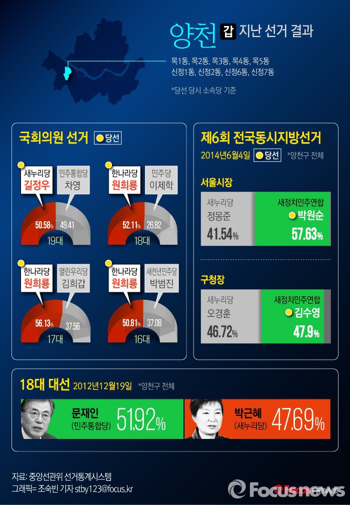 이렇듯 총선에서는 여당이 강세를 보이는 지역이지만 양천구 전체로 보면 야권 성향이 두드러진다. 지난 2012년 열린 18대 대통령 선거에서 양천갑은 박근혜 대통령(47.69%)이 아닌 문재인 더민주 대표(51.92%)를 선택했다.