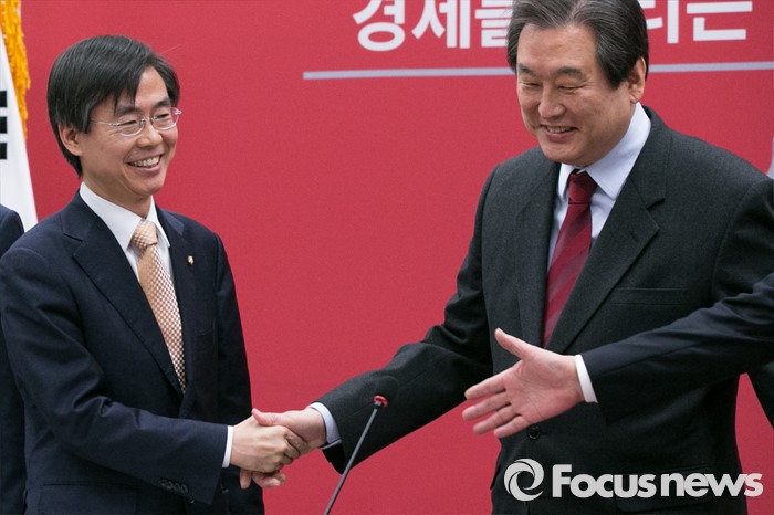 (서울=포커스뉴스) 더불어민주당을 탈당한 조경태(왼쪽) 의원이 21일 오전 서울 여의도 국회에서 열린 새누리당 최고위원회의에 참석해 입당 원서를 제출한 뒤, 김무성 대표와 악수하고 있다.