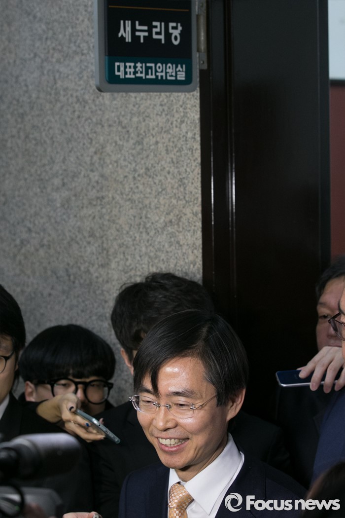 (서울=포커스뉴스) 더불어민주당을 탈당한 조경태 의원이 21일 오전 서울 여의도 국회에서 열린 새누리당 최고위원회의에 참석해 입당원서를 제출한 뒤 기자질문에 답변하고 있다.