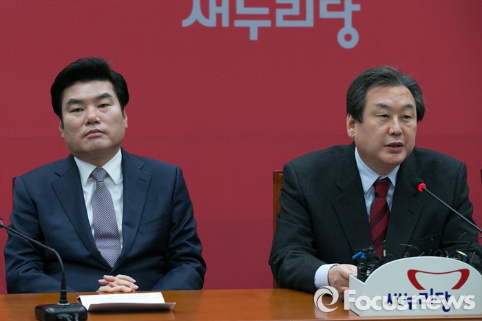 (서울=포커스뉴스) 김무성(오른쪽) 새누리당 대표가 21일 오전 서울 여의도 국회에서 열린 최고위원회의에 참석해 모두발언하는 동안, 원유철 원내대표가 생각에 잠겨 있다.