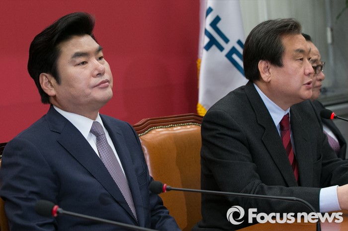 (서울=포커스뉴스) 김무성(가운데) 새누리당 대표가 21일 오전 서울 여의도 국회에서 열린 최고위원회의에 참석해 모두발언하는 동안, 원유철(왼쪽) 원내대표가 경청하고 있다.
