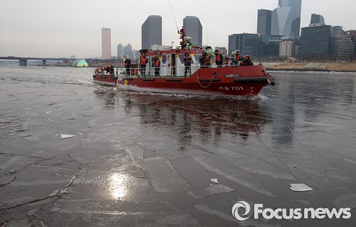 (서울=포커스뉴스) 절기상 '대한' 이며 한강이 공식 결빙된 것으로 발표된 21일 오전 서울 영등포구 여의도동 한강에서 119 특수구조단 수난구조대 대원들이 수난구조정을 동원해 쇄빙작업을 하고 있다. 한강 결빙 관측은 한강대교 노량진 방향 2번째와 4번째 교각 사이에서 이루어지며 상류 쪽으로 100m 부근의 남북 간 띠 모양 지점이 얼었는지에 따라 결빙 여부를 판정한다.