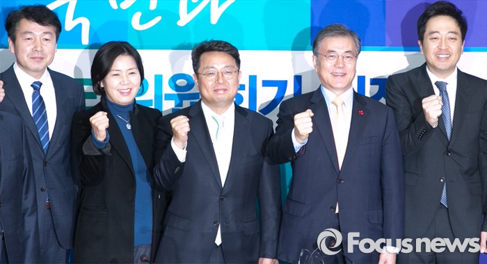 (서울=포커스뉴스) 21일 오전 서울 여의도 국회에서 열린 더불어민주당 뉴파티특별위원회 출범 회의에 앞서 기동민(왼쪽부터) 전 서울시 정무부시장, 양향자 전 삼성전자 상무, 이철희 두문정치전략연구소장, 문재인 대표, 금태섭 변호사가 취재진을 향해 포즈를 취하고 있다.