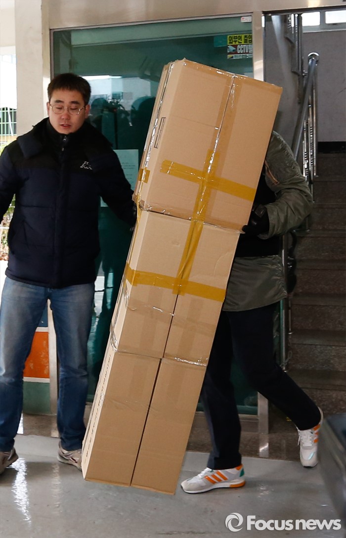 (부천=포커스뉴스) 부천 초등생 살해사건의 두번째 현장검증이 실시된 21일 오전 피의자의 전 거주지로 알려진 부천 원미구 한 빌라에서 경찰이 시신을 유기한 냉장고로 재연된 종이 상자를 옮기고 있다.