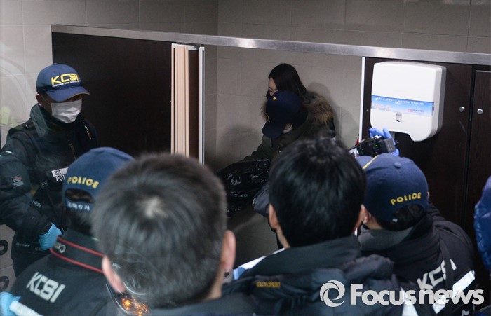 (부천=포커스뉴스) 부천 초등생 살해사건의 첫번째 현장검증이 실시된 21일 오전 부천 원미구 시민회관 화장실에서 피의자 한모 (33)씨가 범행 상황을 재연하고 있다.