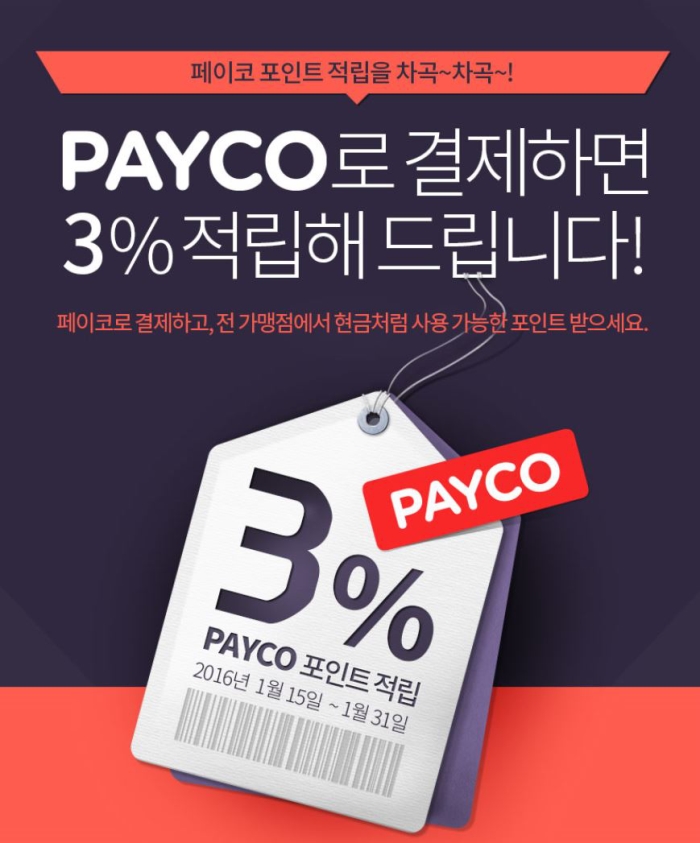 또한 티몬, 인터파크 쇼핑, 예스24, 1300K 등 중대형 가맹점에서도 페이코로 결제 시 총 결제 금액의 3%를 포인트로 적립해 주는 프로모션을 진행 중이다. 포인트는 이벤트 대상 가맹점에서 결제할 때마다 적립되며, 다음 번 결제에 현금와 같이 사용할 수 있는 것이 특징이다. 이외에도 디자인 전문 쇼핑몰 1300K와 리빙 전문 쇼핑몰 1200M은 페이코 전용 특가 코너 활용해 최대 75% 할인가로 상품을 구매할 수 있다.