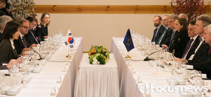 (서울=포커스뉴스) 나경원(왼쪽) 외교통일위원회 위원장이 21일 오후 서울 여의도 국회 사랑재에서 북한의 제4차 핵실험 후속 대책 논의를 위한 주한유럽연합(EU) 회원국 대사 초청 오찬간담회를 주재하고 있다.
