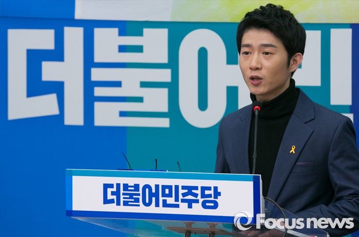 (서울=포커스뉴스) 세월호 참사 현장을 22일간 취재했던 부산 청년 오창석 씨가 21일 오후 서울 여의도 국회에서 열린 더불어민주당 인재영입 기자회견에 참석해 인사말을 하고 있다.