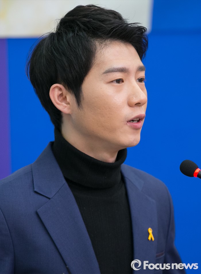 (서울=포커스뉴스) 세월호 참사 현장을 22일간 취재했던 부산 청년 오창석 씨가 21일 오후 서울 여의도 국회에서 열린 더불어민주당 인재영입 기자회견에 참석해 인사말을 하고 있다.