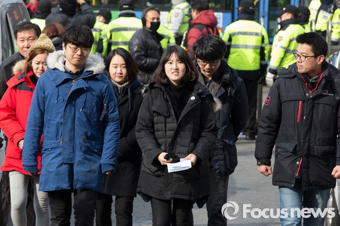 (서울=포커스뉴스) 한일 위안부 협상 폐기를 요구하며 주한일본대사관 앞 '평화의 소녀상' 인근에서 노숙 농성과 집회를 벌인 혐의로 출석요구서를 받은 대학생들이 21일 오후 서울 종로경찰서 앞에서 '소녀상을 지키는 대학생 표적수사 규탄 기자회견'을 끝내고 경찰서로 출석하고 있다.