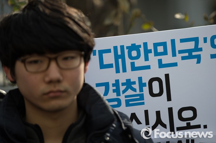 (서울=포커스뉴스) 한일 위안부 협상 폐기를 요구하며 주한일본대사관 앞 '평화의 소녀상' 인근에서 노숙 농성과 집회를 벌인 혐의로 출석요구서를 받은 대학생들이 21일 오후 서울 종로경찰서 앞에서 '소녀상을 지키는 대학생 표적수사 규탄 기자회견'을 하고 있다.