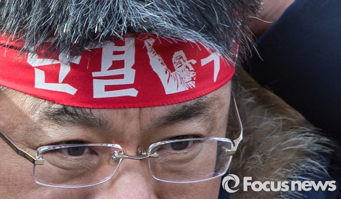 (서울=포커스뉴스) 21일 오후 서울 서초구 서울중앙지방법원 인근에서 열린 전교조 탄압 분쇄 결의대회에서 변성호 전국교직원노동조합 위원장이 머리띠를 두르고 있다.