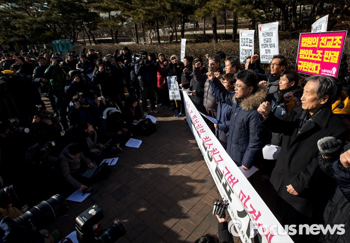 (서울=포커스뉴스) 21일 오후 서울 서초구 서울중앙지방법원 인근에서 열린 법외노조 통보처분 취소청구 고법 판결에 대한 전교조 입장 발표 기자회견에서 변성호 전국교직원노동조합 위원장 및 노조원들이 구호를 외치고 있다.